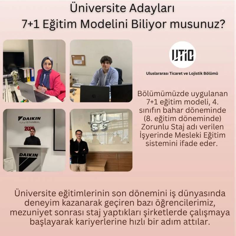 7+1 Eğitim Modeli sayesinde derslerde edindiğiniz teorik bilgileri uygulamalı olarak deneyimleyebilir ve böylece iş hayatına bir adım önde başlayabilirsiniz.