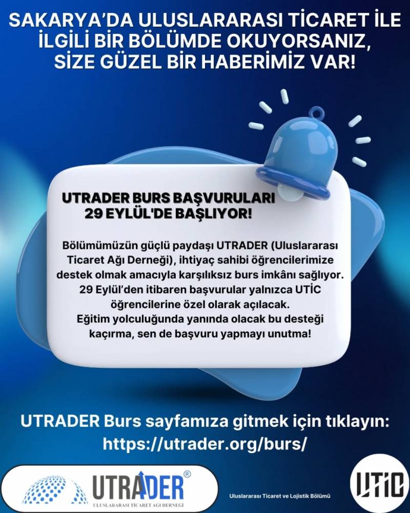 Bölümümüzün en önemli paydaşlarından biri olan Uluslararası Ticaret Ağı Derneği (UTRADER), her yıl olduğu gibi bu yıl da eğitim bursu kapsamında UTİC öğrencilerine özel burs imkânı sunuyor.