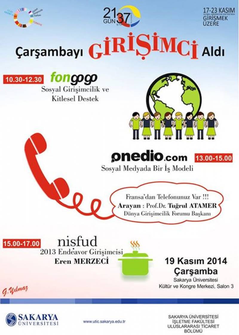 Sakarya Üniversitesi Uluslararası Ticaret Bölümü olarak paydaşlarından olduğumuz ve 150 ülkede kutlanan Global Girişimcilik Haftası, üniversitemizde 19 Kasım 2014 tarihinde 3 farklı konferans ile gerçekleştirilecektir. Etkinliğe dair detaylar ekte bulunmaktadır.