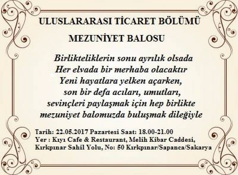Yeni hayatlara yelken açarken, son bir defa acıları, umutları, sevinçleri paylaşmak için hep birlikte mezuniyet balomuzda buluşmak dileğiyle...