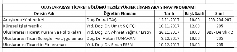 2017 Güz dönemi Uluslararası Ticaret Lisans, Tezli ve Tezsiz Yüksek Lisans programlarımızın vize sınav takvimi ilan edilmiştir.