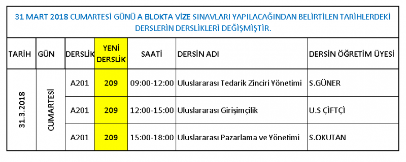 31 MART 2018 Cumartesi Günü, A Blokta Vize Sınavları yapılacağından Uluslararası Ticaret Programı Tezsiz Yüksek Lisans Derslerinin dersliklerinde değişiklik yapılmıştır.