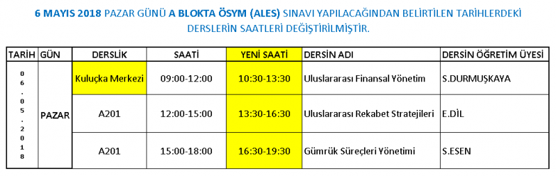 06.05.2018 Pazar günü Fakültemizde yapılacak olan Akademik Personel ve Lisansüstü Eğitimi Giriş Sınavı (ALES) nedeniyle ders saatlerinde değişiklik yapılmıştır.Yeni program ektedir.