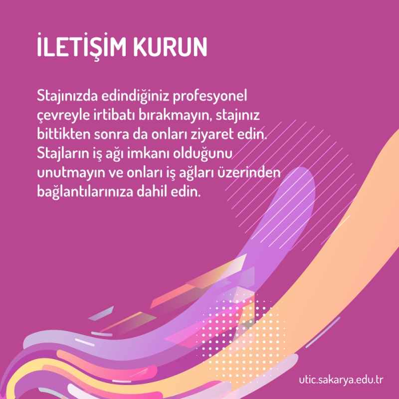 - Stajınızda edindiğiniz profesyonel çevreyle irtibatı bırakmayın, stajınız bittikten sonra da onları ziyaret edin. Stajların iş ağı imkânı olduğunu unutmayın ve onları iş ağları üzerinden bağlantılarınıza dâhil edin.