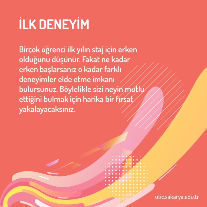 - Birçok öğrenci ilk yılın staj için erken olduğunu düşünür. Fakat ne kadar erken başlarsanız o kadar farklı deneyimler elde etme imkânı bulursunuz. Böylelikle sizi neyin mutlu ettiğini bulmak için harika bir fırsat yakalayacaksınız.
