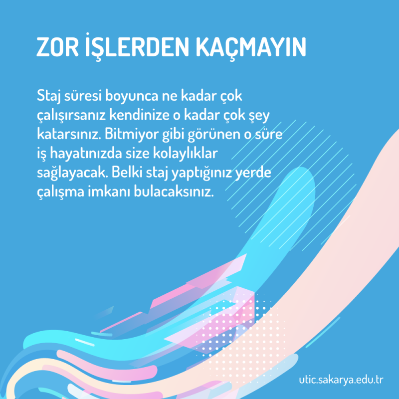 - Staj süresi boyunca ne kadar çok çalışırsanız kendinize o kadar çok şey katarsınız. Bitmiyor gibi görünen o süre iş hayatınızda size kolaylıklar sağlayacak. Belki staj yaptığınız yerde çalışma imkânı bulacaksınız.