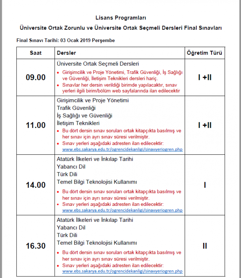 Üniversitemiz Lisans Bölümlerinde/Programlarında okutulan Üniversite Ortak Zorunlu (Türk Dili / Atatürk İlkeleri / TBTK / İngilizce) ve Üniversite Ortak Seçmeli Derslerinin Yılsonu Sınavları ekteki tabloya uygun olarak yapılacaktır.