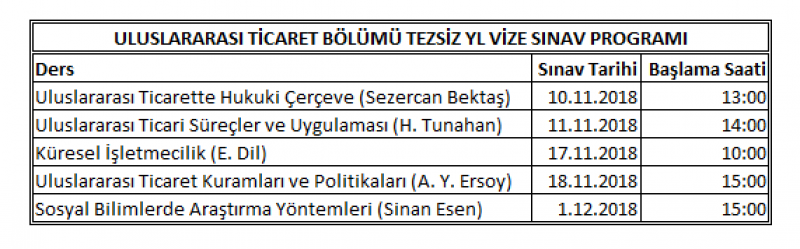 Bölümümüzün 2018-2019 Güz Dönemi Tezsiz Yüksek Lisans Vize Programı ektedir.