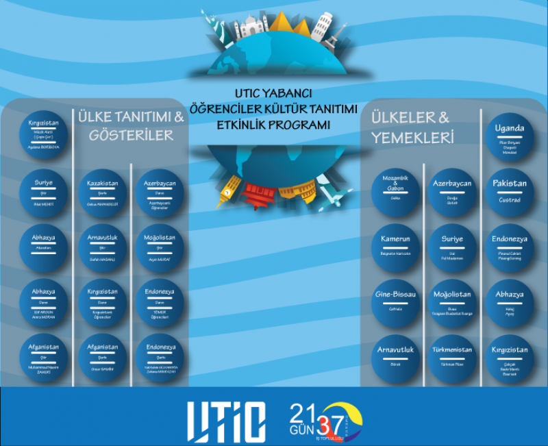 21 Gün 37 Derece İş Topluluğu’nun düzenlediği; dans, şiir, ülke tanıtımı ve yöresel yemek ikramının olacağı eğlenceli UTİC Uluslararası Öğrencilerin Kültür Tanıtım Etkinliği'ne hepinizi bekliyoruz. 15 Mart Cuma saat 15:30'da Kültür ve Kongre Merkezi Salon 1’de olacağız.