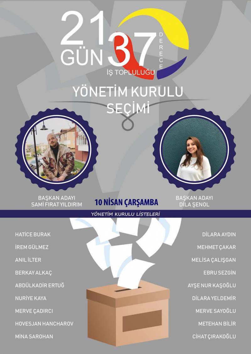 21 Gün 37 Derece İş Topluluğu olarak yeni yönetim kurulumuzu seçiyoruz. Seçimde yer alan aday arkadaşlarımıza başarılar dileriz.