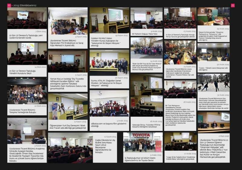 b) 21 gün37° İş Topluluğu, düzenleyeceği etkinlikleri her eğitim-öğretim yılının başlangıcından itibaren planlayarak Ekim ayı içerisinde Spor, Kültür ve Sanat Birliği Yönetim Kurulu’na bildirmek ve onay almak zorundadırlar. Daha sonra güncel olarak ortaya çıkan ve yapılması düşünülen etkinlikler olursa bunları da etkinlik tarihinden en az bir ay önce Spor, Kültür ve Sanat Birliği’ne bildirilmesi gerekmektedir.